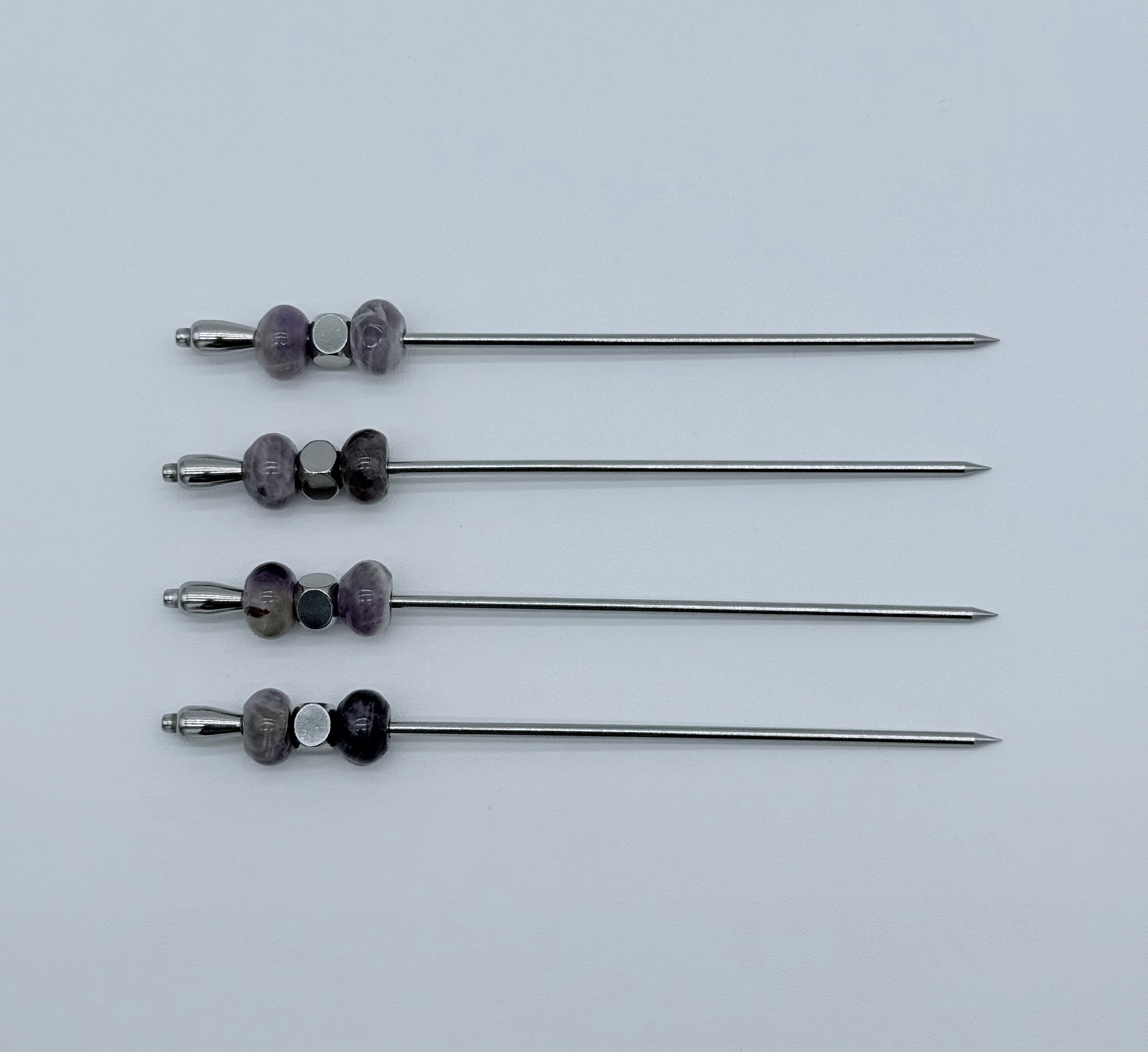 Turn every drink into a statement piece. To personalize your Amethyst cocktail picks, select the accent piece of your choice: 1) Silver Square Spacer; 2) Silver Round Spacer; 3) Clear Rhinestone Spacer; OR 4) Iridescent Rhinestone Spacer.