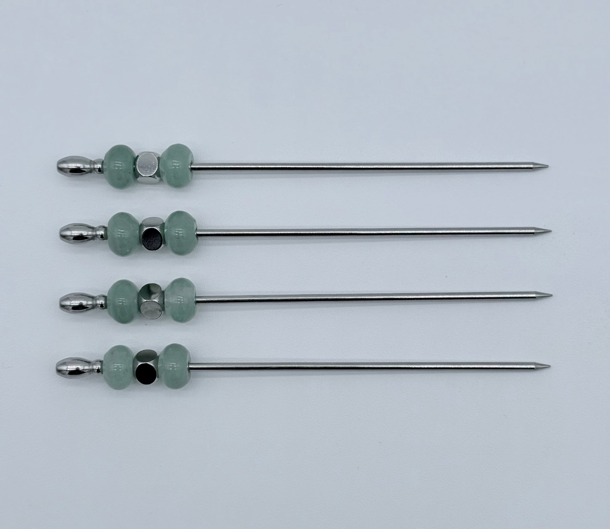 Turn every drink into a statement piece. To personalize your Green Aventurine cocktail picks, select the accent piece of your choice: 1) Silver Square Spacer; 2) Silver Round Spacer; 3) Clear Rhinestone Spacer; OR 4) Iridescent Rhinestone Spacer.