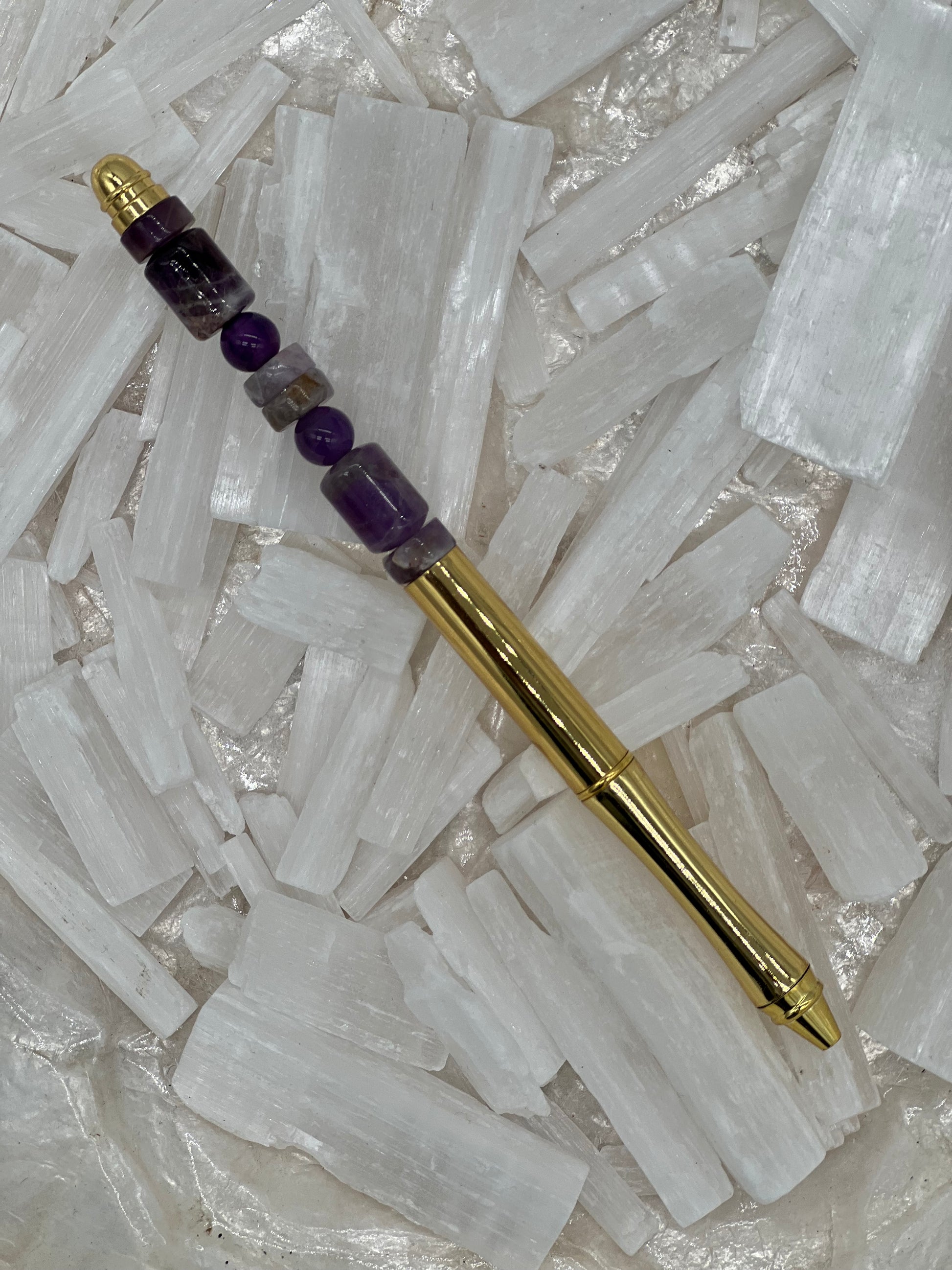 Our crystal pens serve as tools to amplify your manifestation abilities. Amethyst helps to encourage us to grow towards higher potential and spiritual expansion. It can also be used for protection and purification. Amethyst brings calming energy, peace, and good luck. Infuse your Amethyst pen with your intention, visualize while holding it, and write down your goals and aspirations. Turn your dreams into reality!